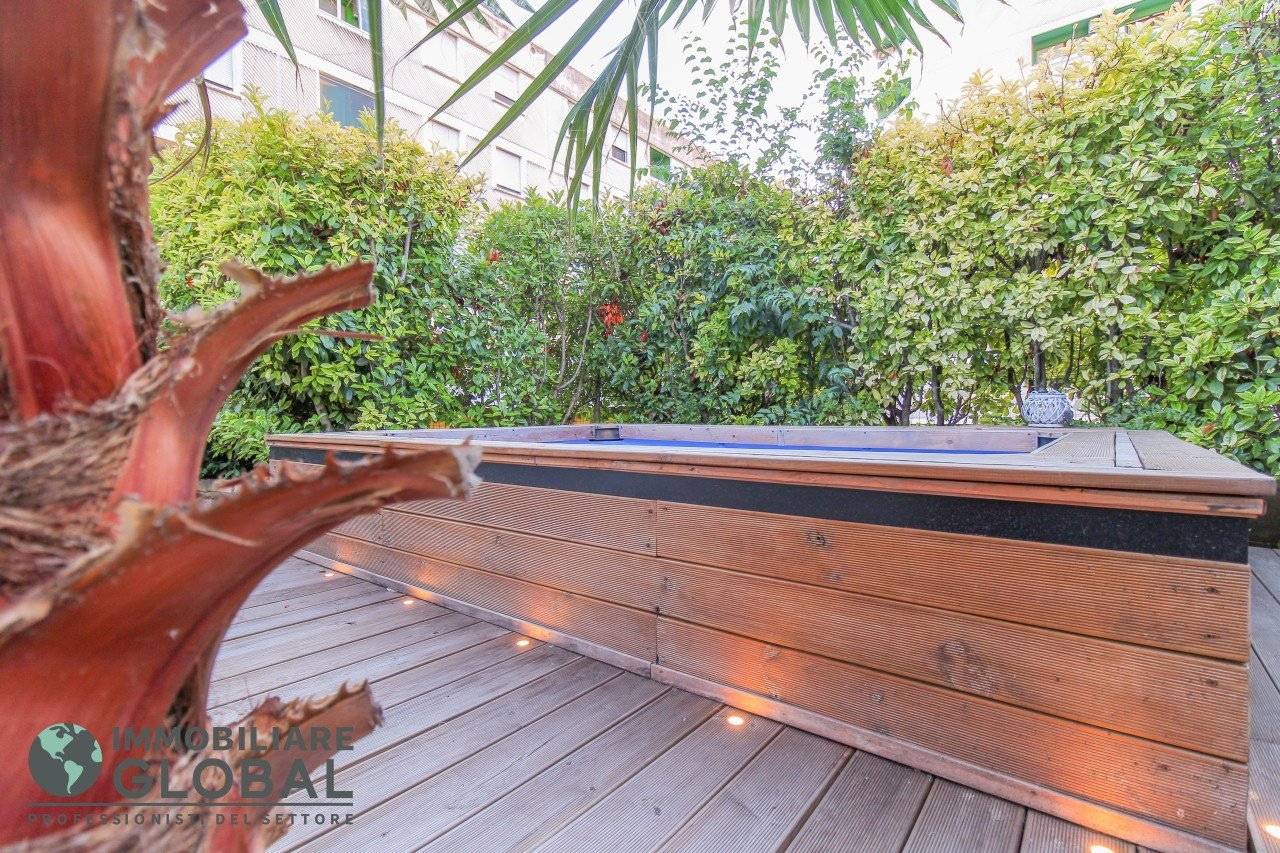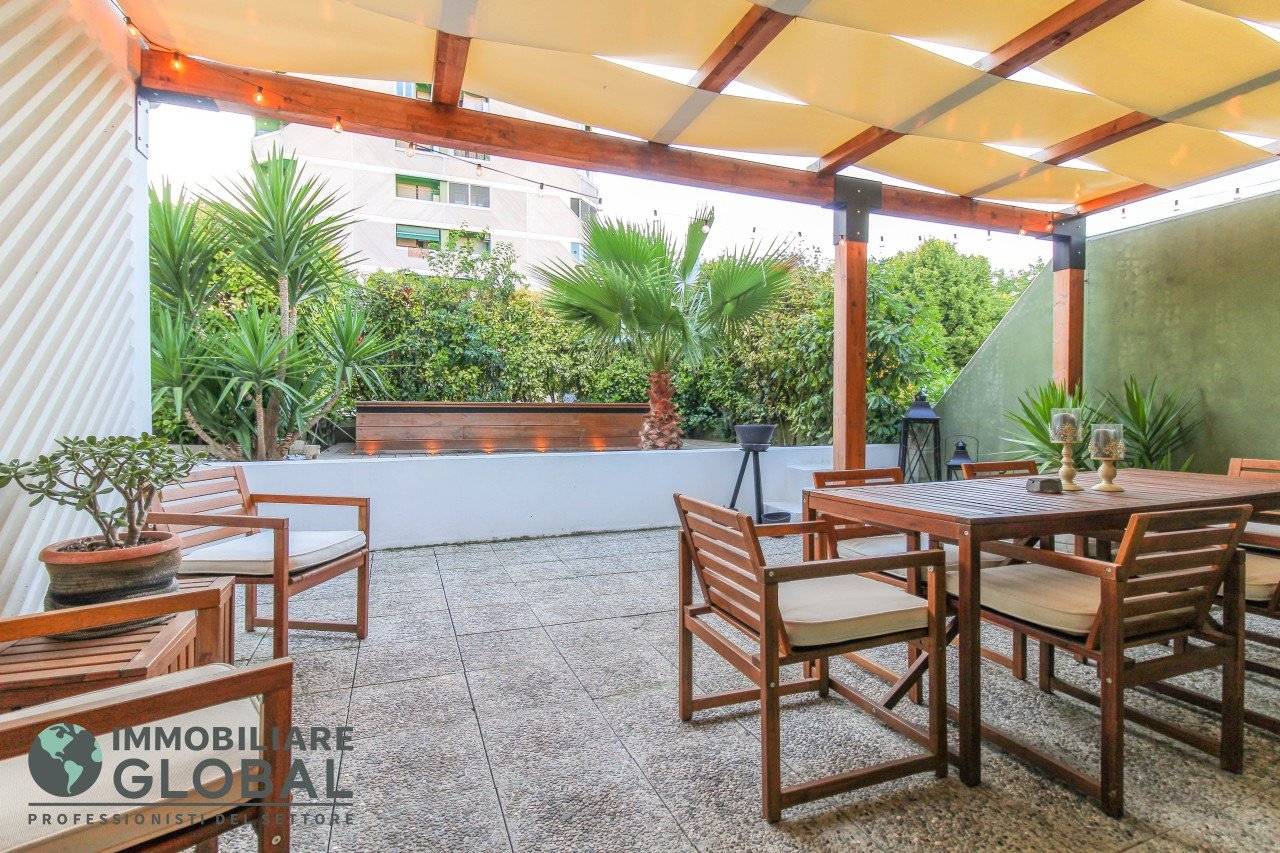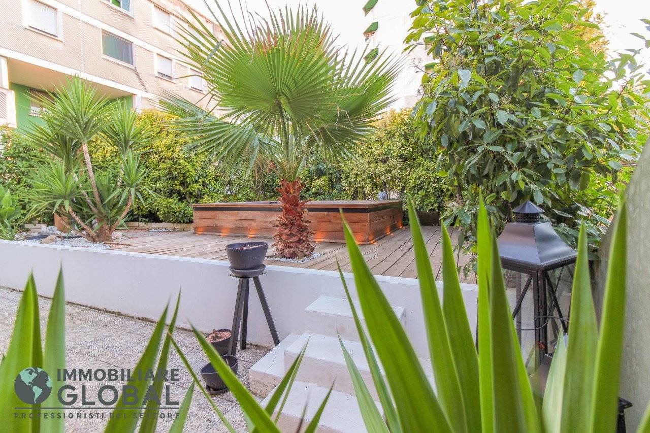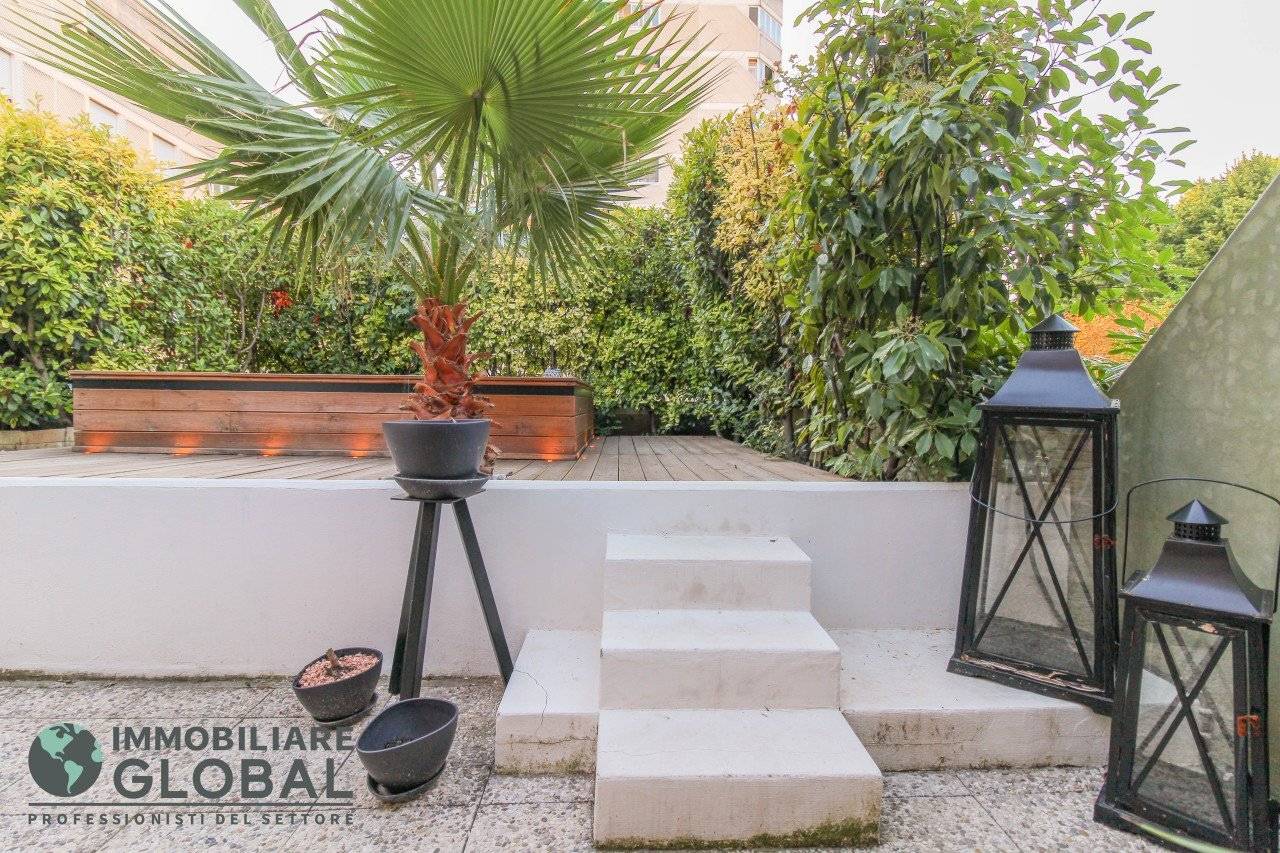 La zona giorno si apre con un living di ampie dimensioni, reso luminoso e arioso da una grande vetrata che collega direttamente all'esterno. La cucina, perfettamente integrata nello spazio, è a vista e consente di vivere ogni momento della giornata in modo fluido e conviviale. Il grande terrazzo con giardino pensile rappresenta il vero valore aggiunto dell'appartamento: uno spazio esterno progettato per essere vissuto tutto l'anno, dotato di impianto di irrigazione automatizzato, ideale per rilassarsi, ricevere ospiti o godersi la quiete privata all'aperto.
