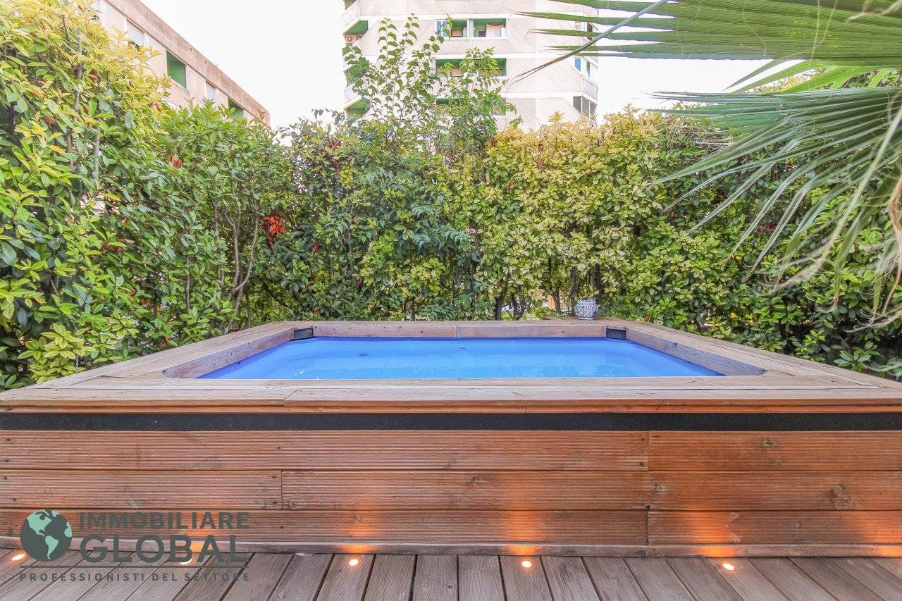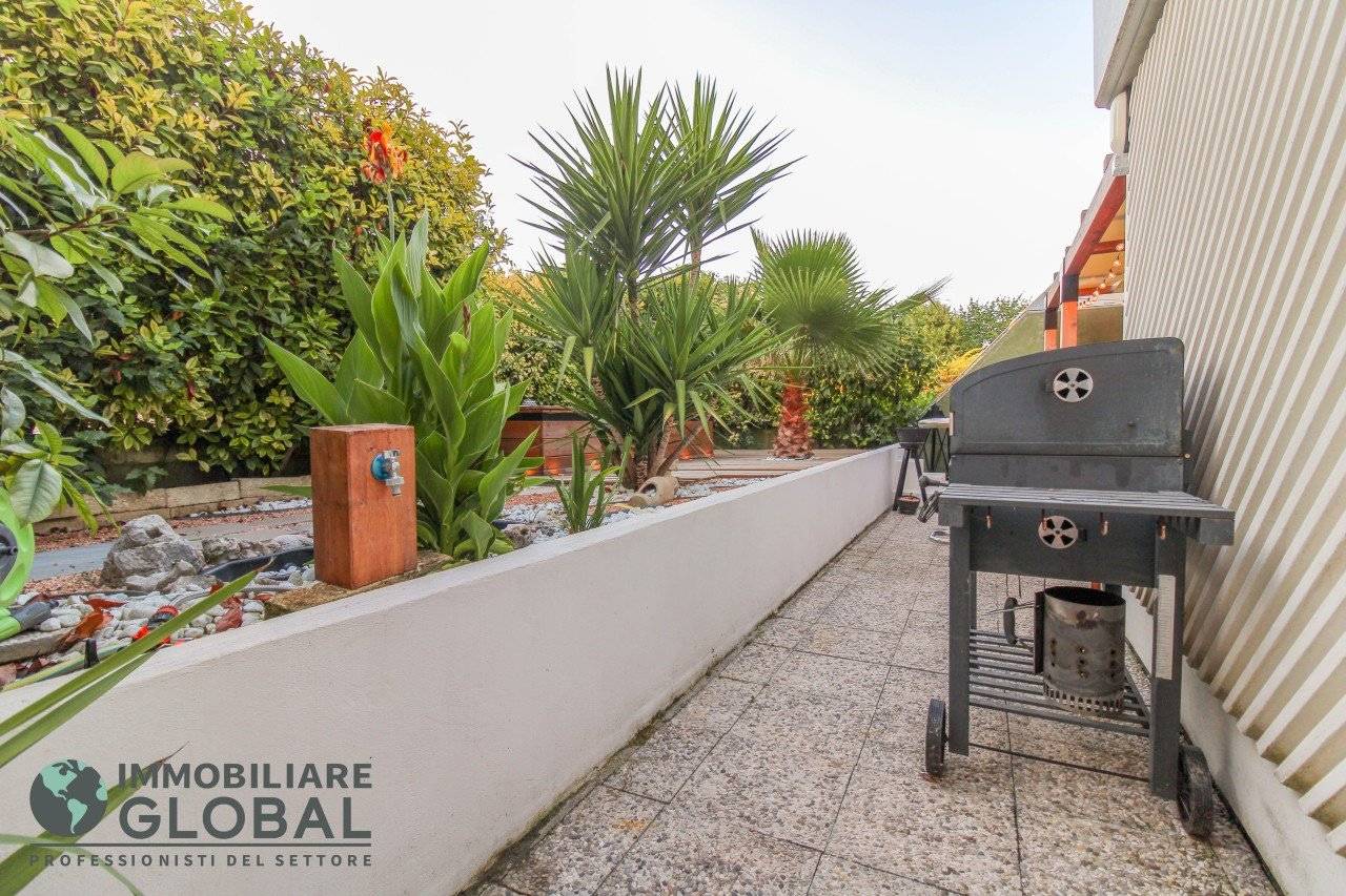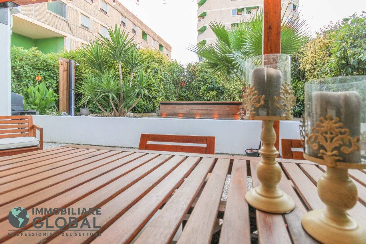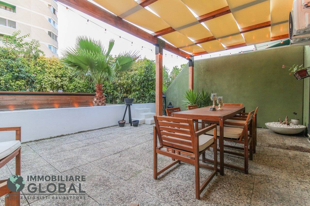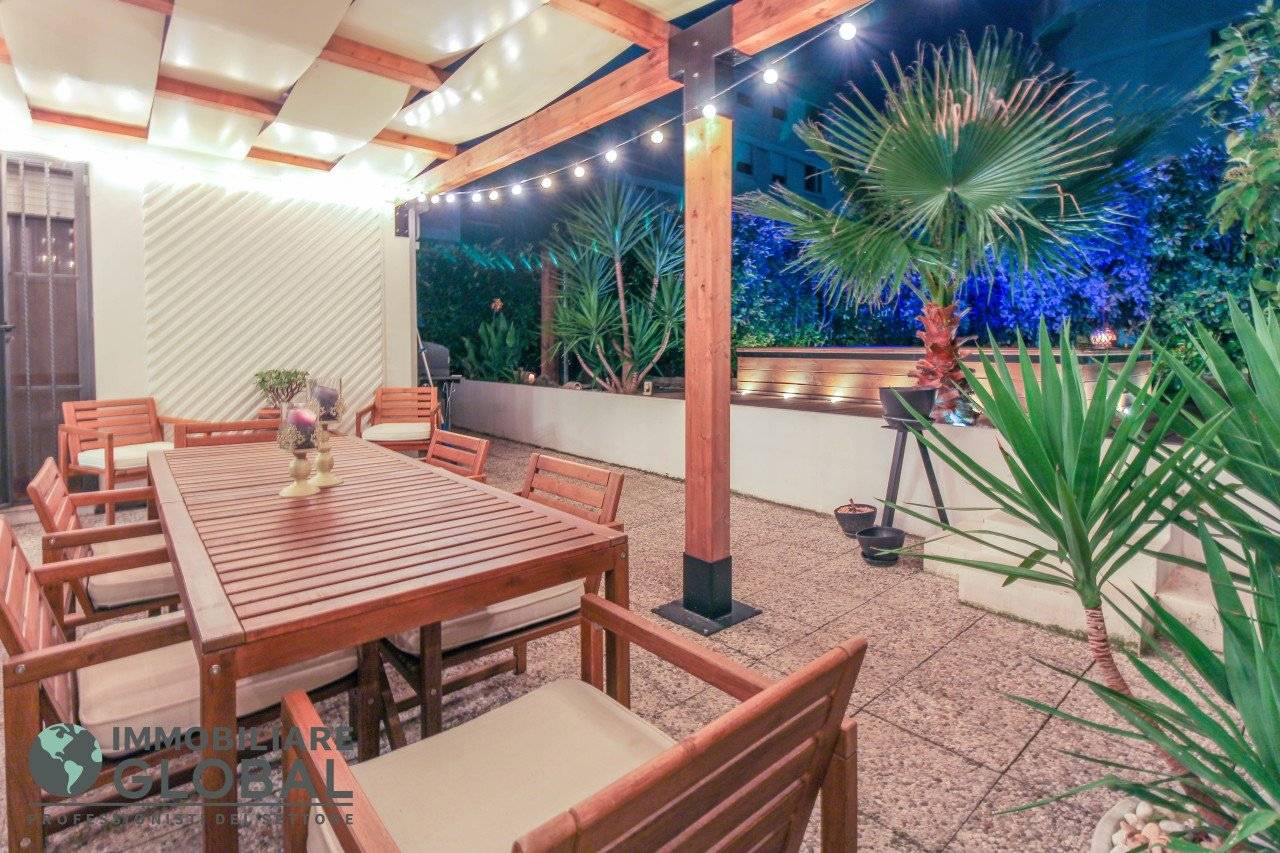 La zona giorno si apre con un living di ampie dimensioni, reso luminoso e arioso da una grande vetrata che collega direttamente all'esterno. La cucina, perfettamente integrata nello spazio, è a vista e consente di vivere ogni momento della giornata in modo fluido e conviviale. Il grande terrazzo con giardino pensile rappresenta il vero valore aggiunto dell'appartamento: uno spazio esterno progettato per essere vissuto tutto l'anno, dotato di impianto di irrigazione automatizzato, ideale per rilassarsi, ricevere ospiti o godersi la quiete privata all'aperto.