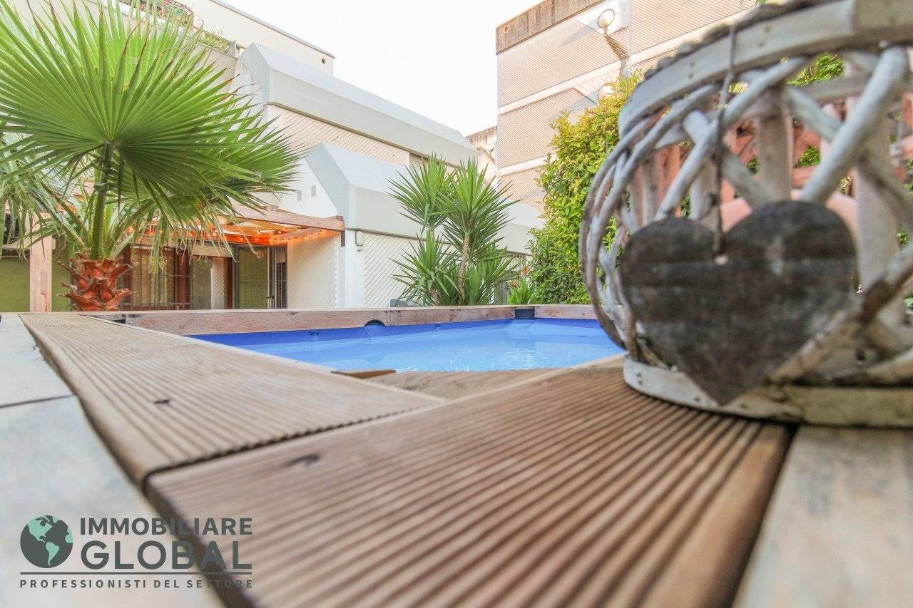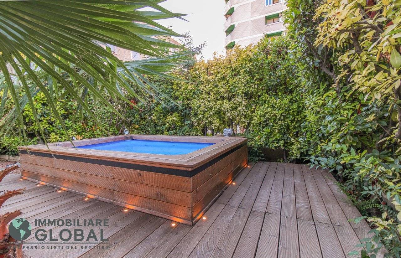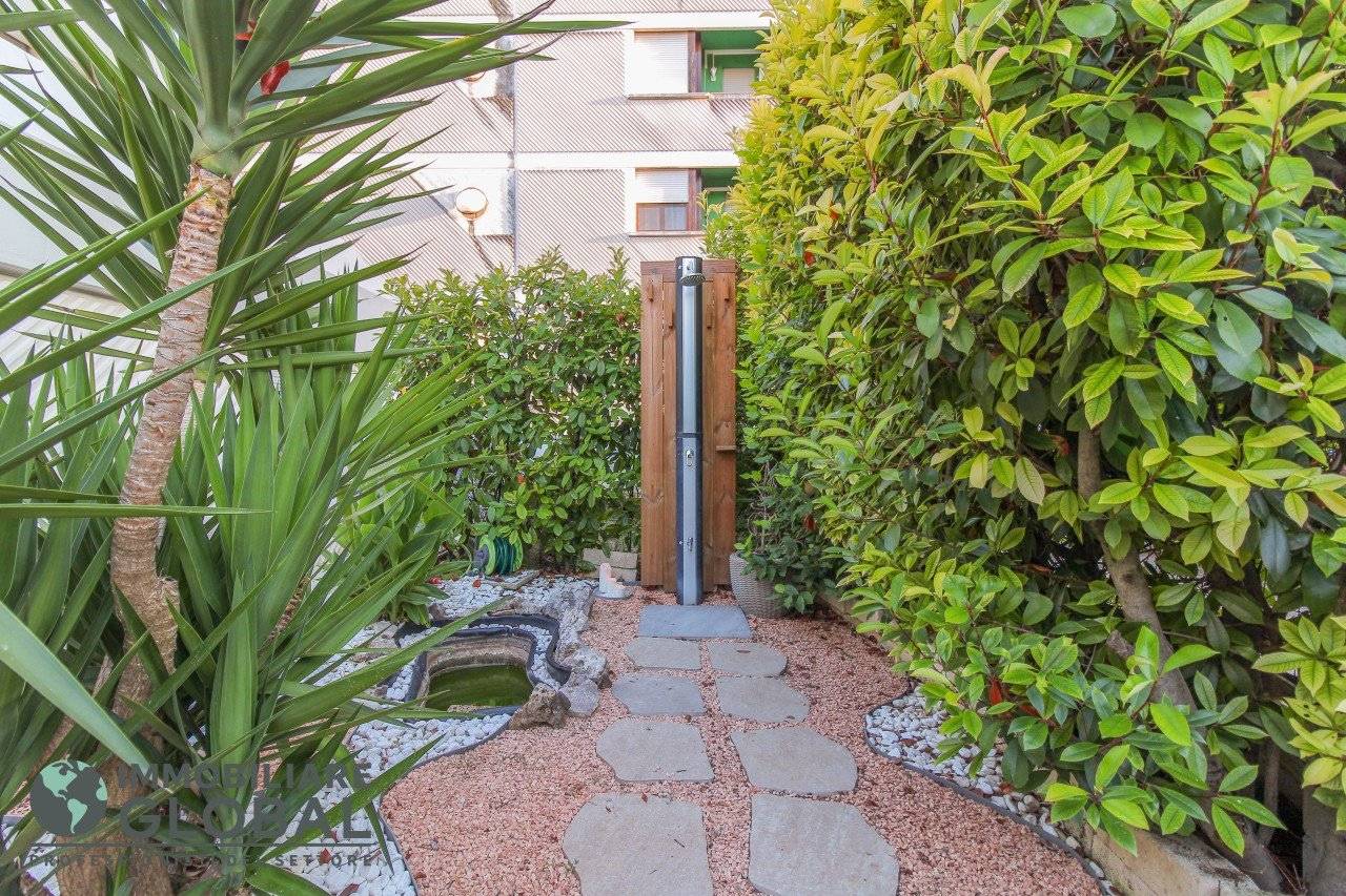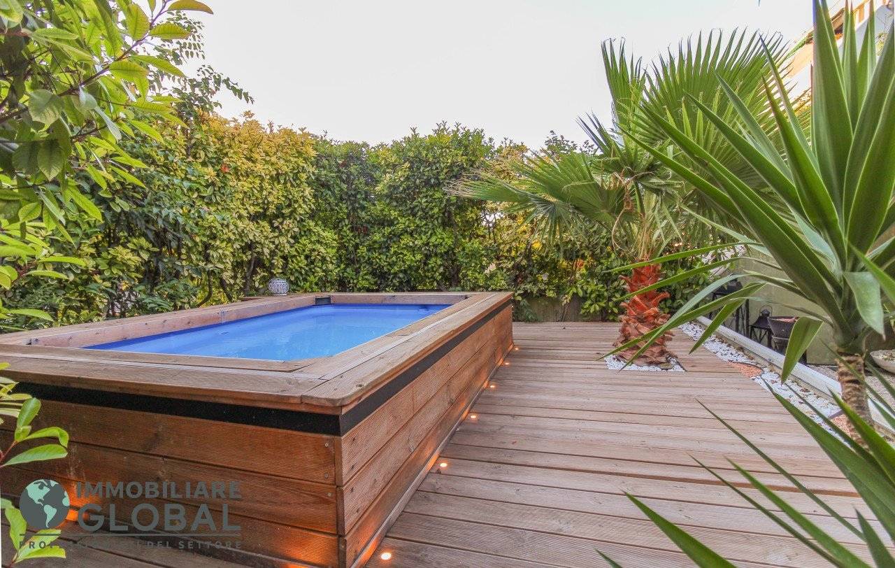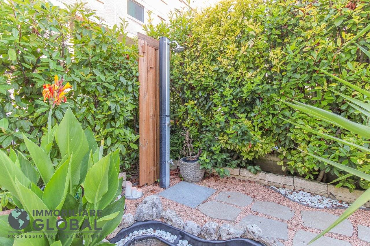 La zona giorno si apre con un living di ampie dimensioni, reso luminoso e arioso da una grande vetrata che collega direttamente all'esterno. La cucina, perfettamente integrata nello spazio, è a vista e consente di vivere ogni momento della giornata in modo fluido e conviviale. Il grande terrazzo con giardino pensile rappresenta il vero valore aggiunto dell'appartamento: uno spazio esterno progettato per essere vissuto tutto l'anno, dotato di impianto di irrigazione automatizzato, ideale per rilassarsi, ricevere ospiti o godersi la quiete privata all'aperto.