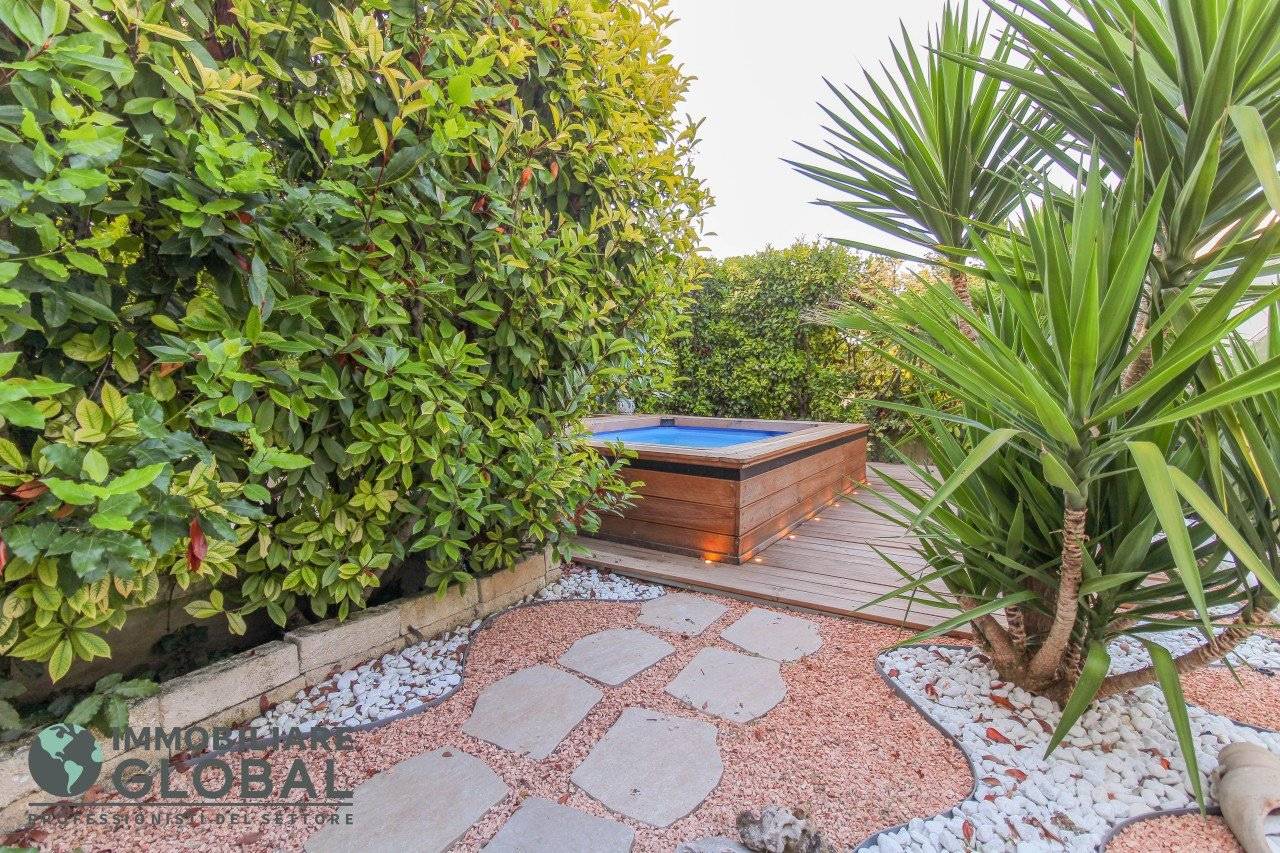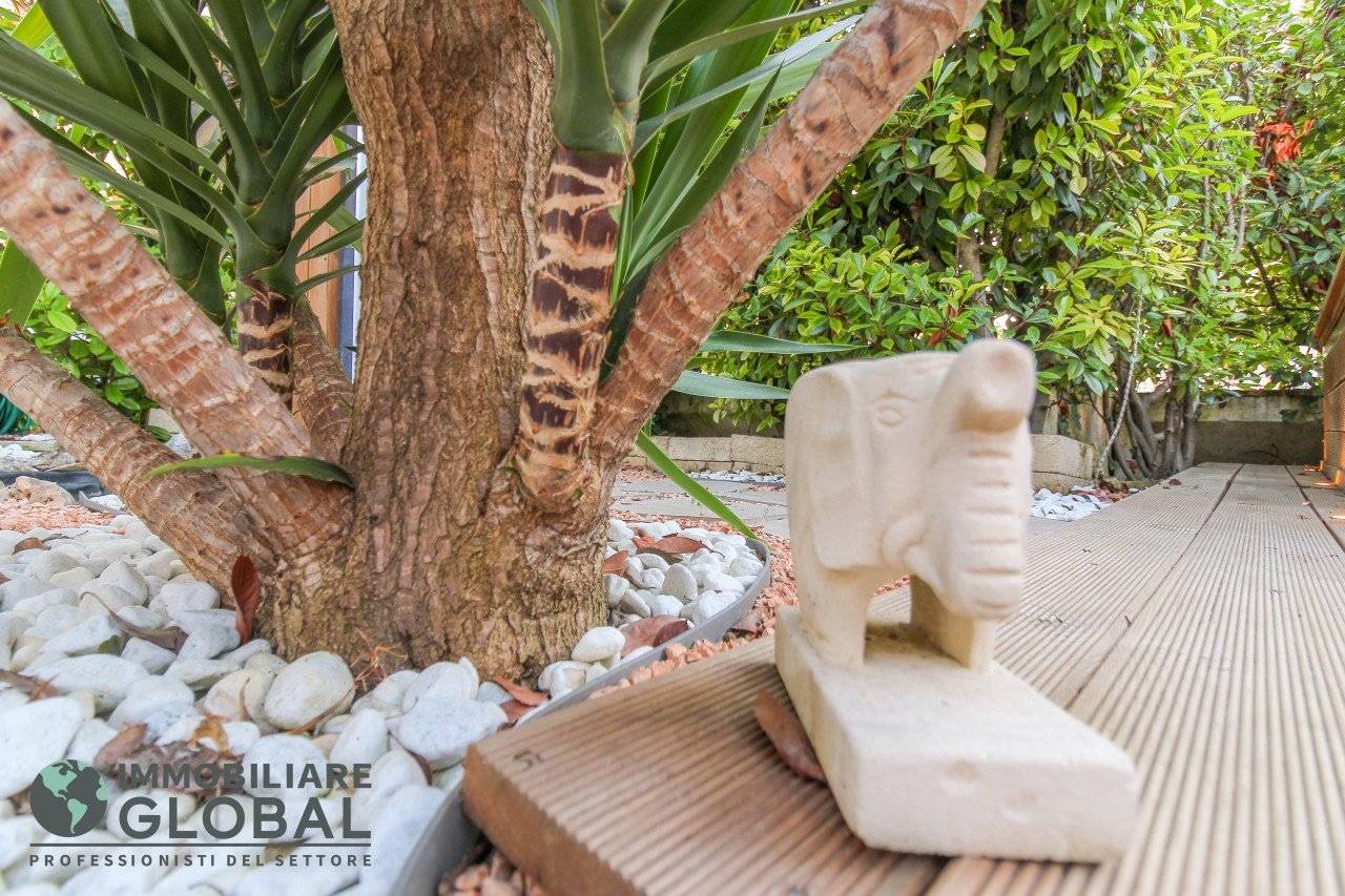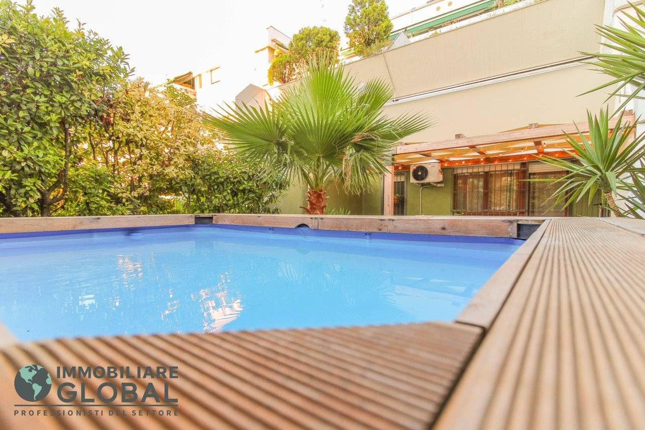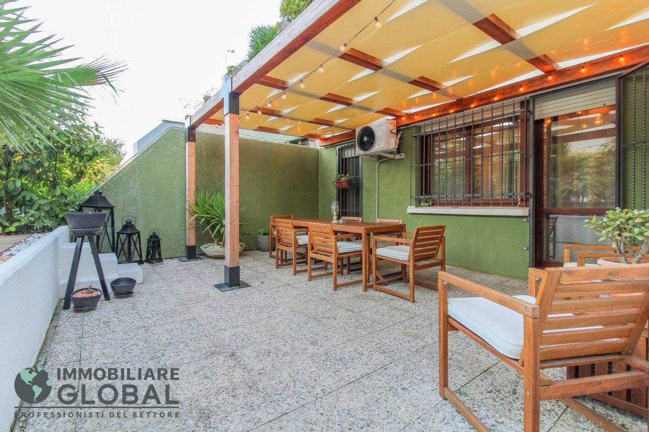 La zona giorno si apre con un living di ampie dimensioni, reso luminoso e arioso da una grande vetrata che collega direttamente all'esterno. La cucina, perfettamente integrata nello spazio, è a vista e consente di vivere ogni momento della giornata in modo fluido e conviviale. Il grande terrazzo con giardino pensile rappresenta il vero valore aggiunto dell'appartamento: uno spazio esterno progettato per essere vissuto tutto l'anno, dotato di impianto di irrigazione automatizzato, ideale per rilassarsi, ricevere ospiti o godersi la quiete privata all'aperto.