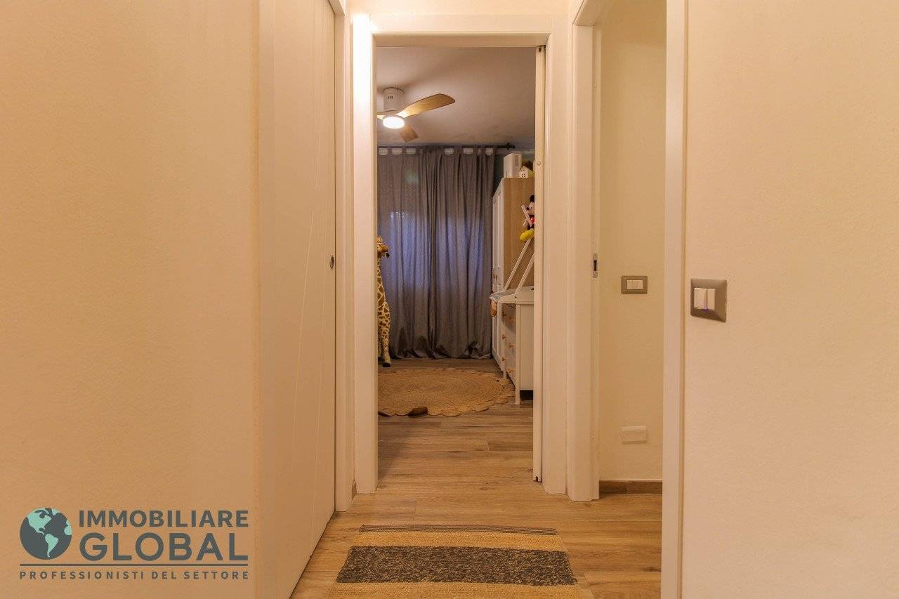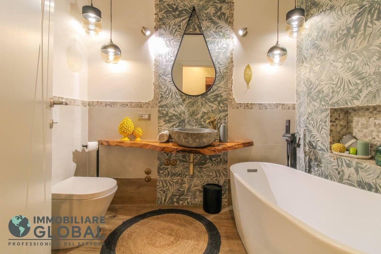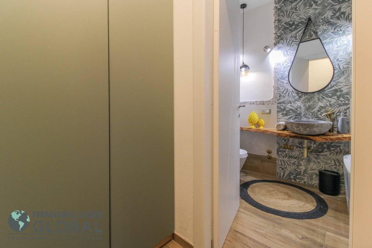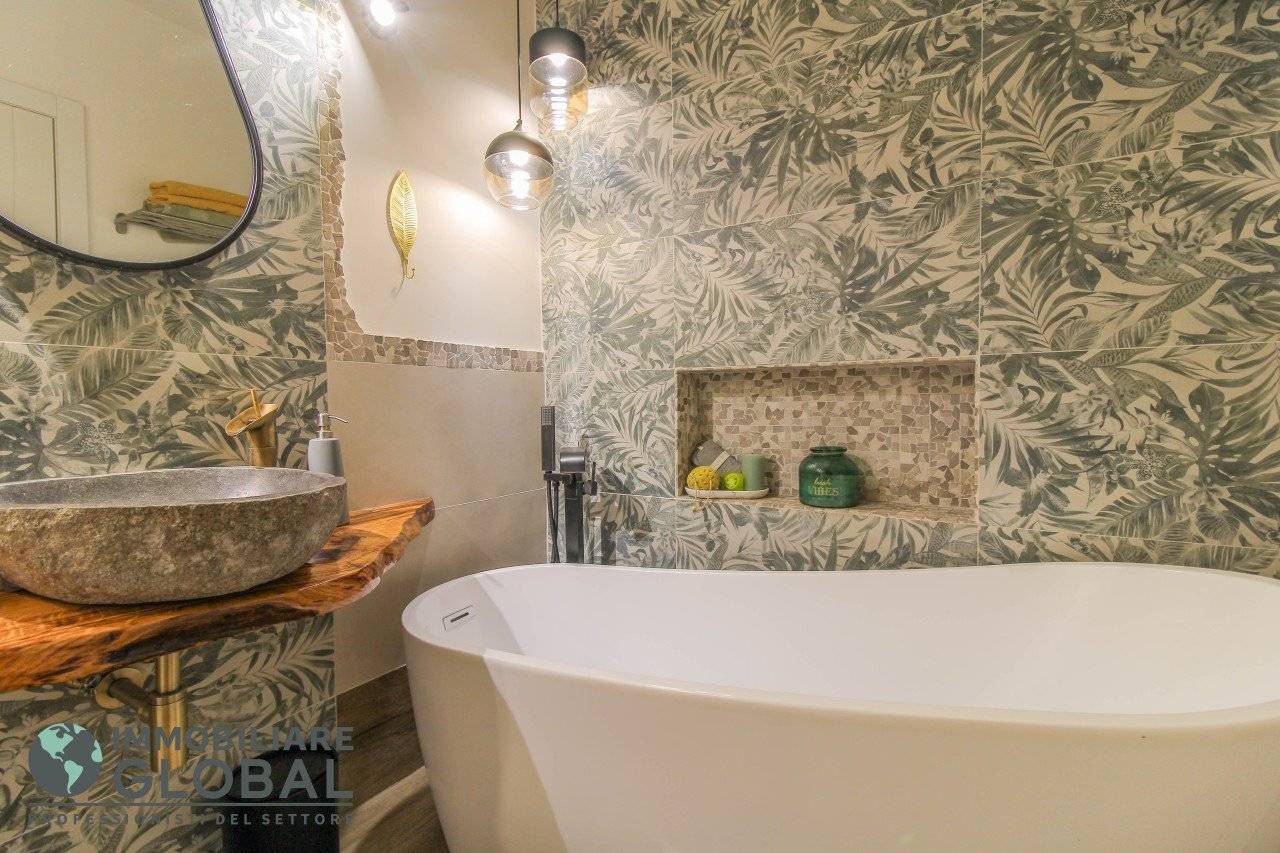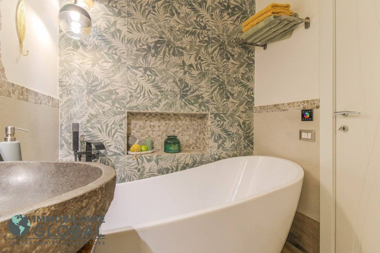 L'intervento di ristrutturazione del 2019 ha trasformato completamente l'immobile, rendendolo contemporaneo e raffinato. La nuova pavimentazione in gres porcellanato rettificato effetto legno attraversa l'intera abitazione, creando continuità visiva e calore in ogni ambiente. L'impianto elettrico e idraulico è stato completamente rifatto, così come i due bagni, uno con vasca e uno con doccia, progettati con finiture ricercate che trasmettono una sensazione di benessere e relax. Le porte interne di design e il sistema di climatizzazione canalizzato completano un quadro abitativo di alto livello.