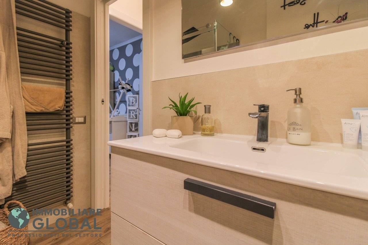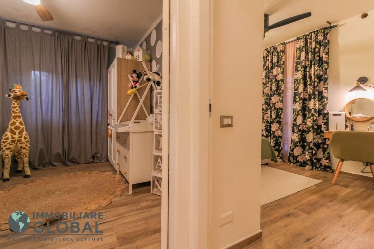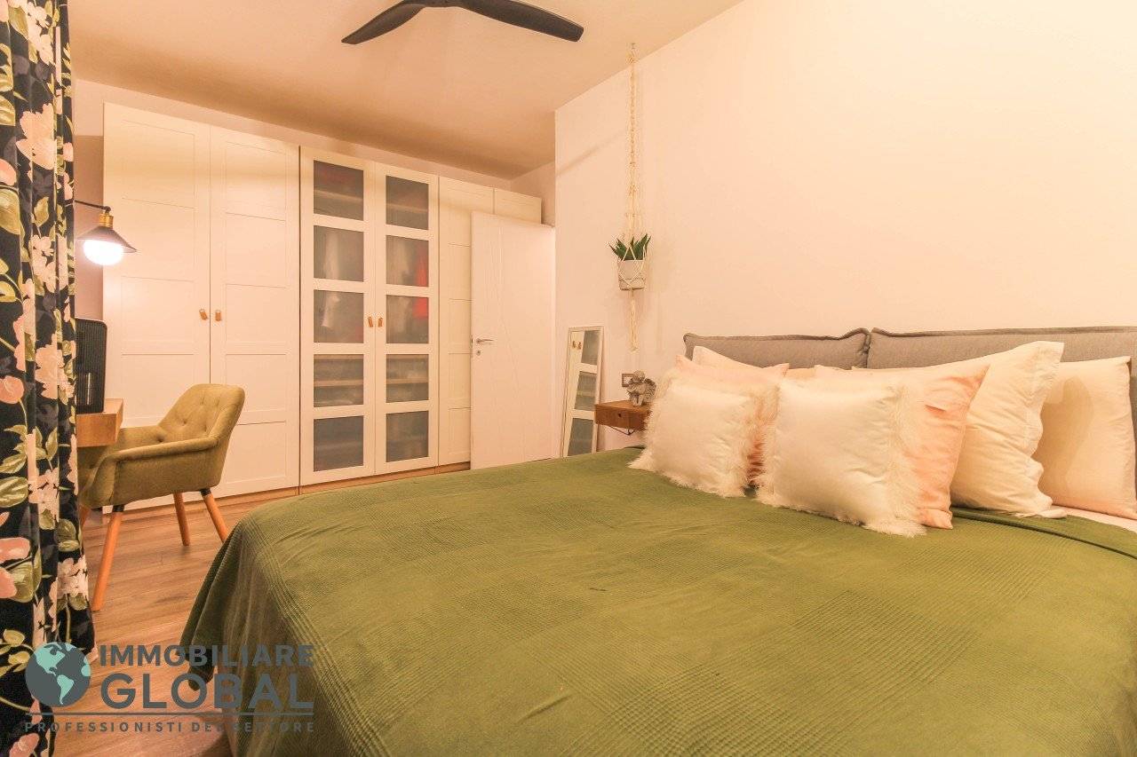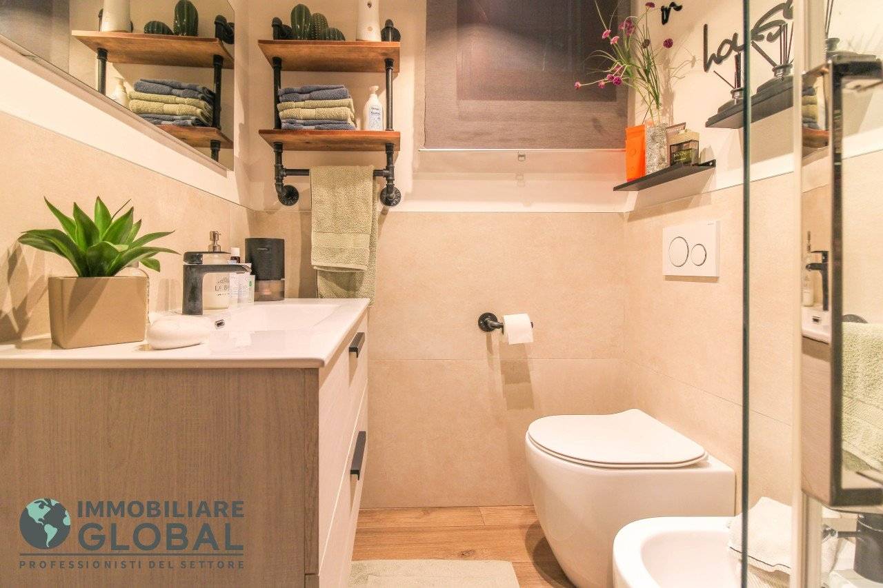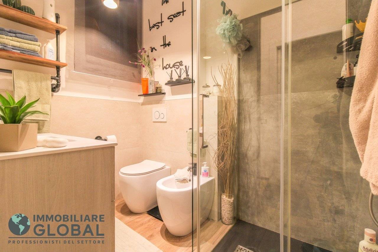L'intervento di ristrutturazione del 2019 ha trasformato completamente l'immobile, rendendolo contemporaneo e raffinato. La nuova pavimentazione in gres porcellanato rettificato effetto legno attraversa l'intera abitazione, creando continuità visiva e calore in ogni ambiente. L'impianto elettrico e idraulico è stato completamente rifatto, così come i due bagni, uno con vasca e uno con doccia, progettati con finiture ricercate che trasmettono una sensazione di benessere e relax. Le porte interne di design e il sistema di climatizzazione canalizzato completano un quadro abitativo di alto livello.