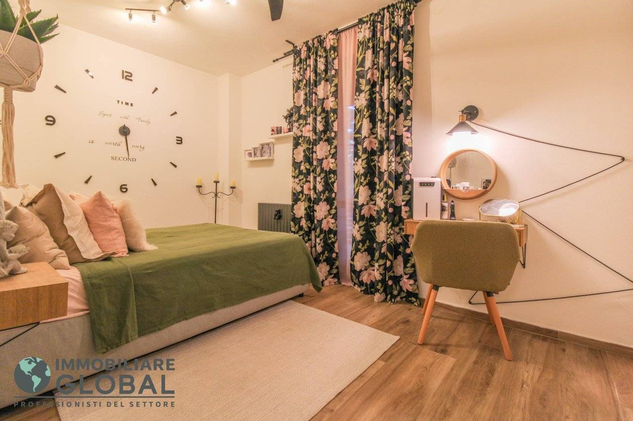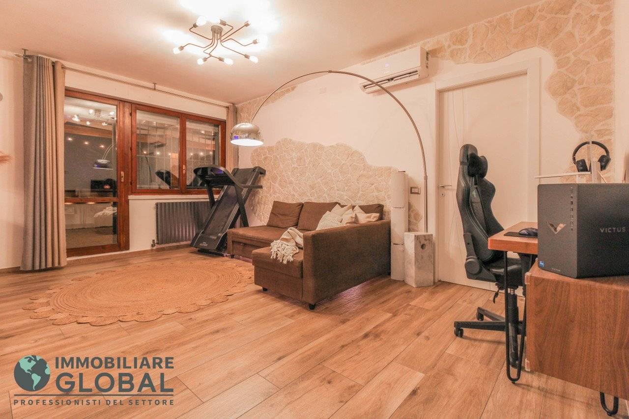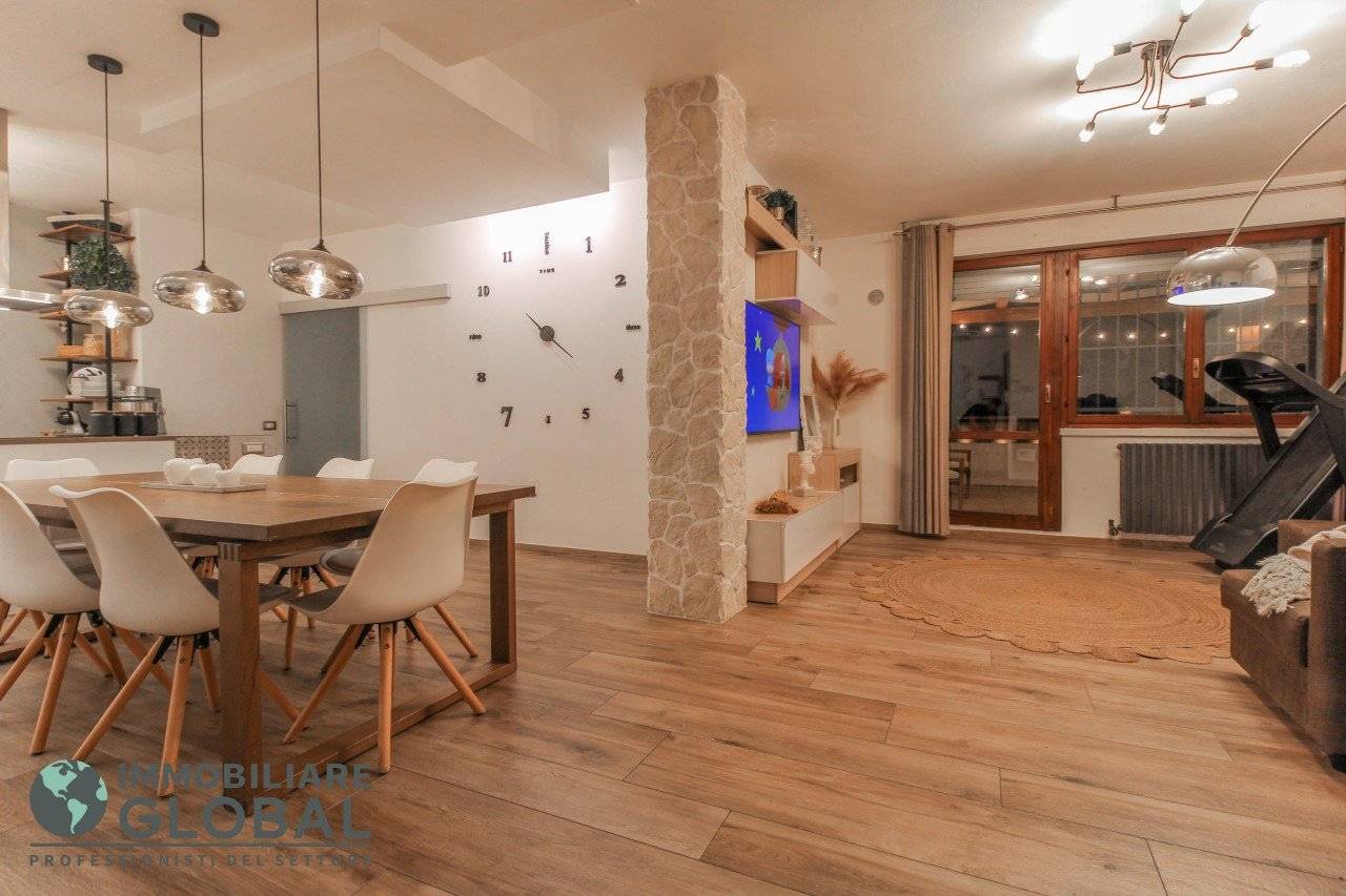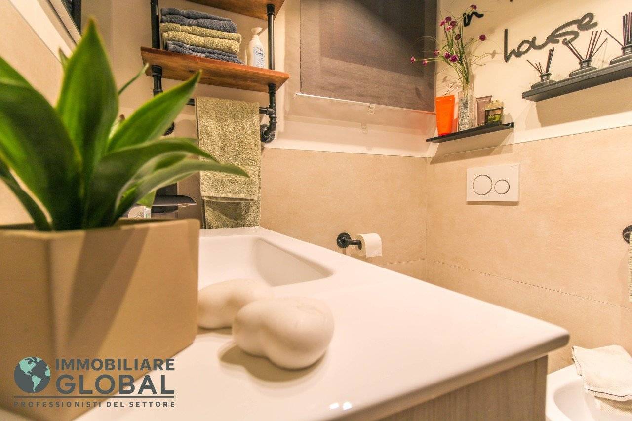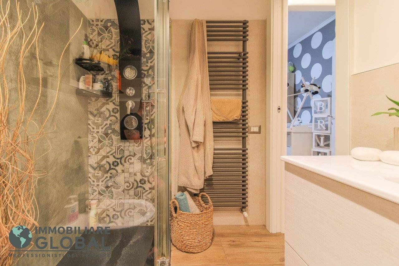 L'intervento di ristrutturazione del 2019 ha trasformato completamente l'immobile, rendendolo contemporaneo e raffinato. La nuova pavimentazione in gres porcellanato rettificato effetto legno attraversa l'intera abitazione, creando continuità visiva e calore in ogni ambiente. L'impianto elettrico e idraulico è stato completamente rifatto, così come i due bagni, uno con vasca e uno con doccia, progettati con finiture ricercate che trasmettono una sensazione di benessere e relax. Le porte interne di design e il sistema di climatizzazione canalizzato completano un quadro abitativo di alto livello.